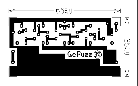 基板のサイズは35×66ミリ。そのうち回路部分は半分で、残りは電池ホルダが乗るスペースになる。ICは使わないから基板のサイズは多少ラフでも構わない。パターンは簡単そのもの。手描きで充分。